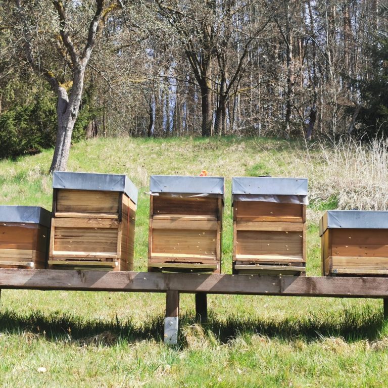 Bei uns auf dem Hof stehen auch 7 Bienenbeuten. Jedes Jahr tragen die fleißigen Bienen für uns leckeren Honig ein. Geschleudert wird maximal 3 Mal im Jahr. Danach dürfen die Bienen ihr Winterfutter eintragen und werden dabei von uns unterstützt.